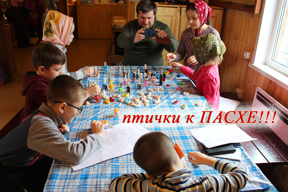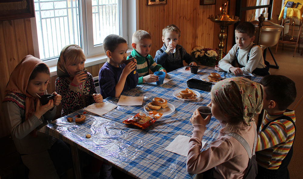 Наша воскресная школа — маленькая, уютная и потому особенная. Уроки и репетиции проходят прямо в храме. Мы усаживаемся за большим столом: рисуем, читаем, обсуждаем важные вещи, поем… А потом, вместе с родителями, пьем чай. К такой форме занятий нас во многом подтолкнули обстоятельства: у школы пока нет отдельного помещения, 8 — 10 учеников невозможно разделить по возрасту, тем более невозможно разделить братьев и сестер, которые пришли заниматься вместе. Но, начав работу, мы поняли, что эти обстоятельства как раз помогают нам наметить верный и интересный путь развития.